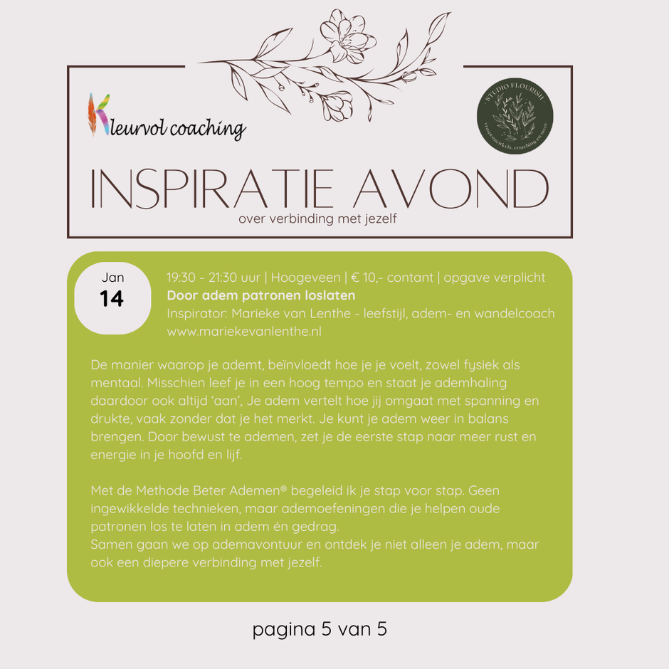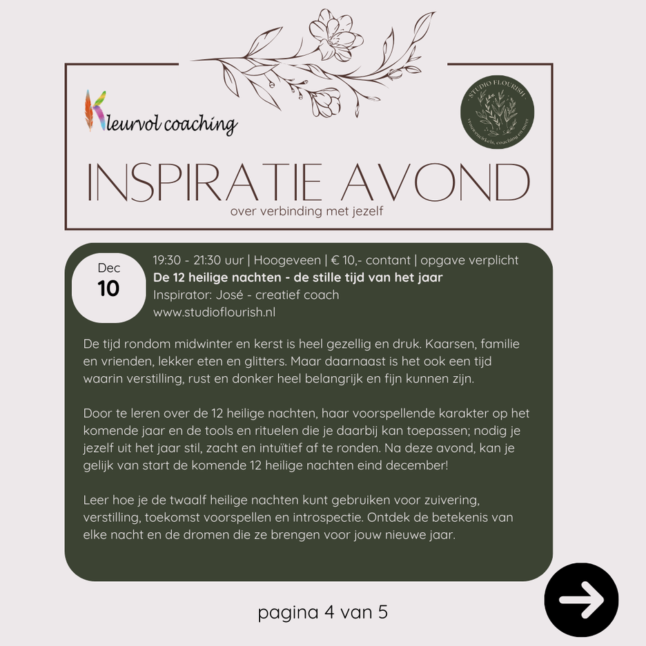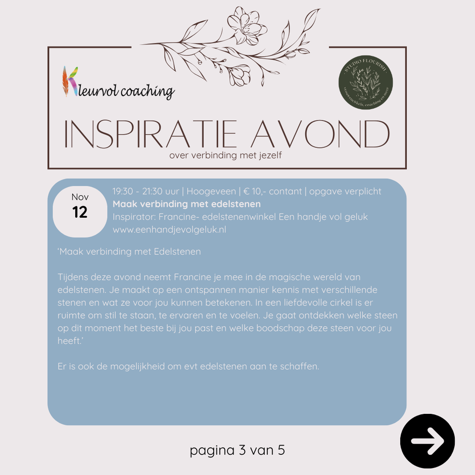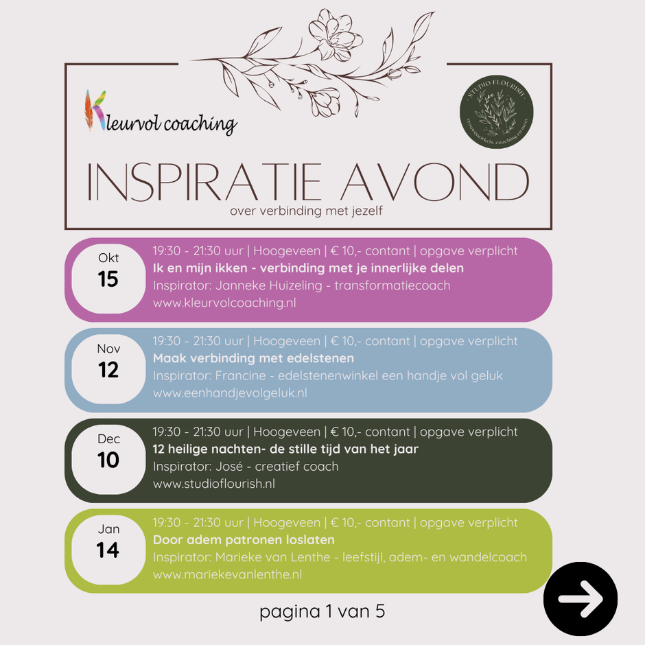 In de ruimte die ik met José (Studio Flourish) deel in Hoogeveen, organiseren wij maandelijks een inspiratie-avond. Gewoon omdat we het zelf leuk vinden en willen inspireren, ervaren en verbinden